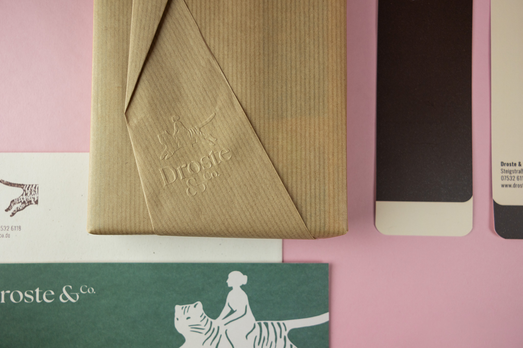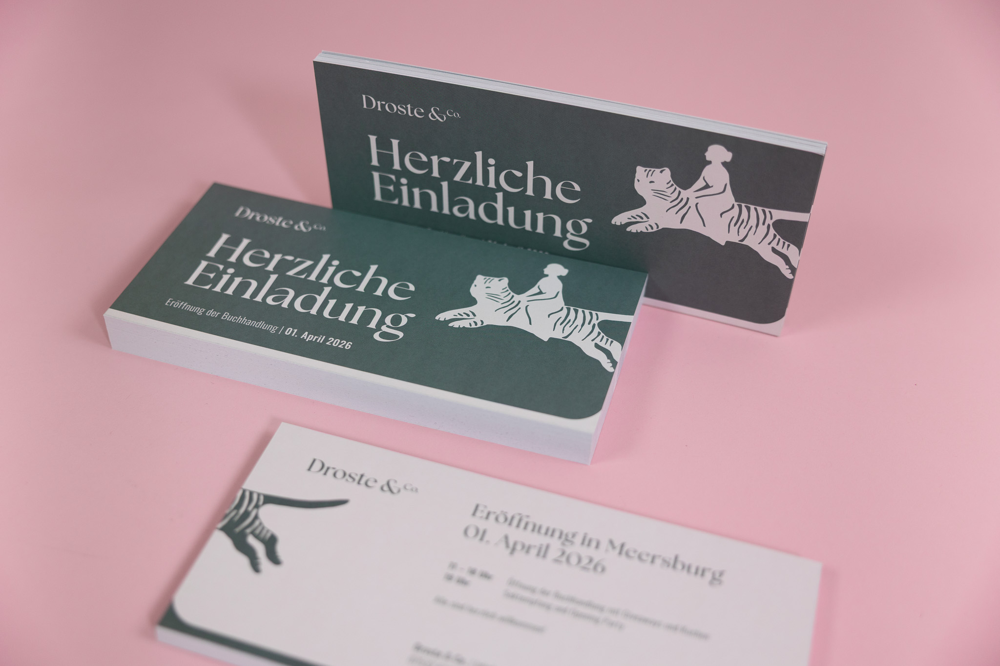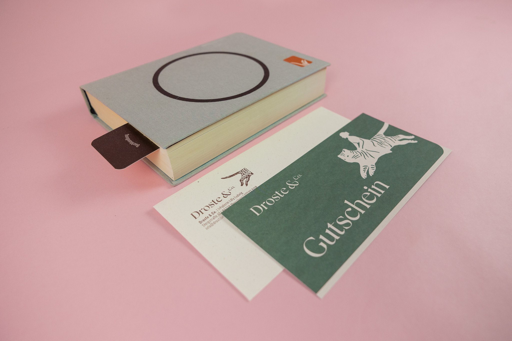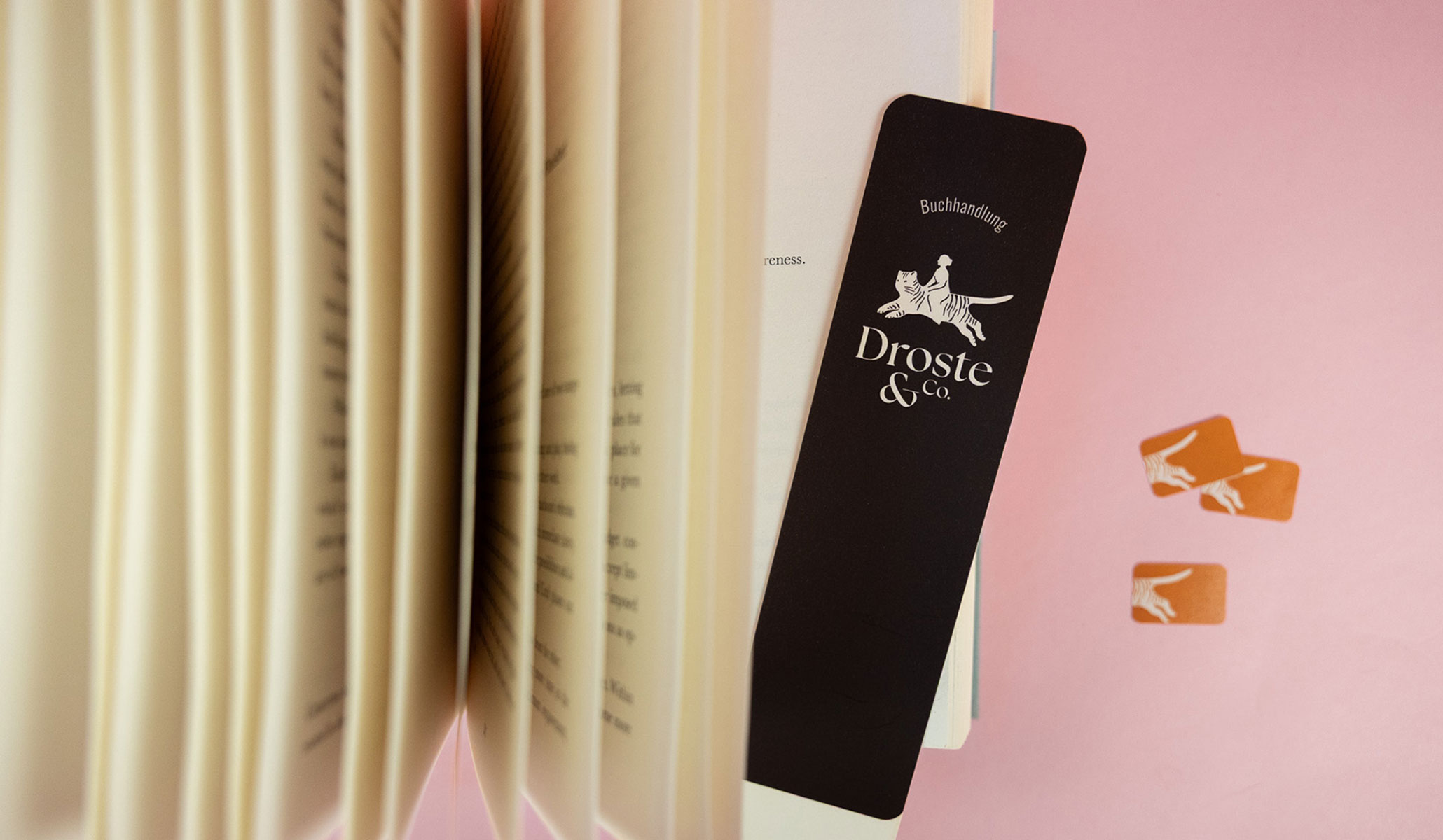Logo und die Tigerin als Key Visual prägen die gesamte Markenwelt von Droste & Co. – von Printprodukten wie Lesezeichen bis zu Laden- und Fensterbeklebungen. Ergänzende Elemente wie Prägezange, Stempel und Aufkleber übertragen die Marke auch auf die eingepackten Bücher. So entsteht ein konsistentes, wiedererkennbares Erscheinungsbild, das den Charakter der Buchhandlung nach außen trägt.